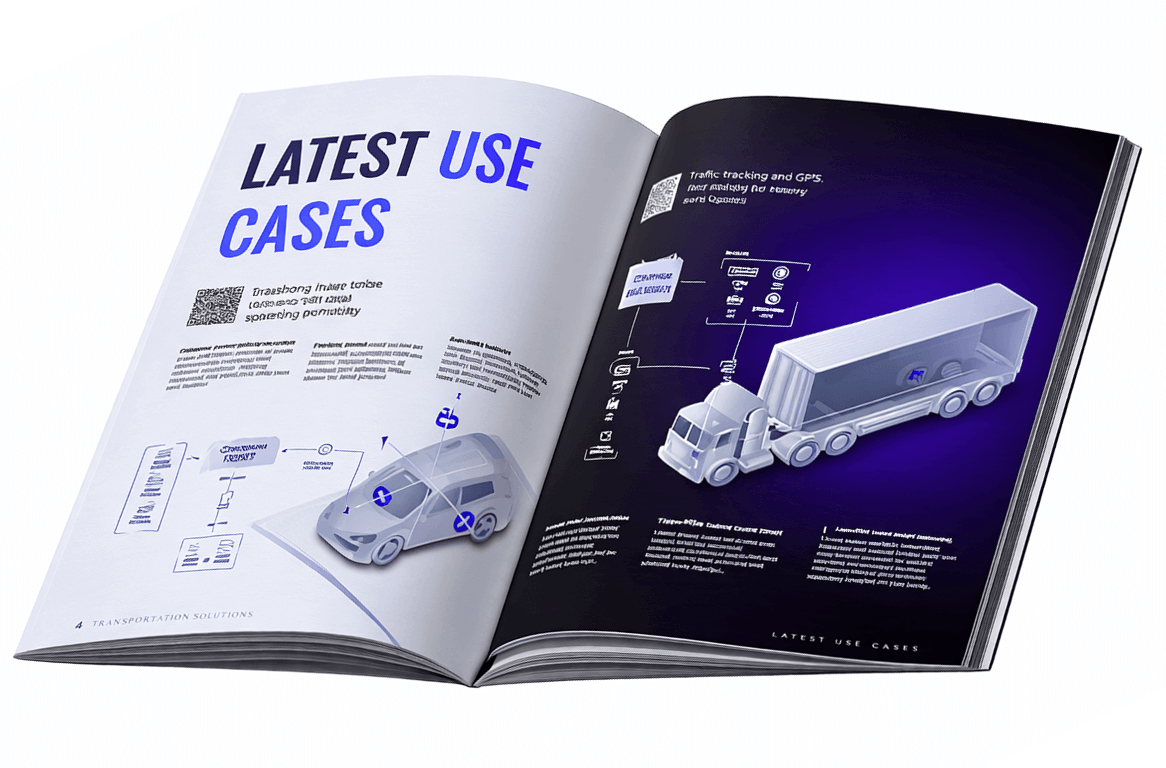 Відкритий журнал на білому фоні з інфографікою про транспорт і логістикуTelematics Journal Vol. 9: технології, стратегія та майбутнє телематики
